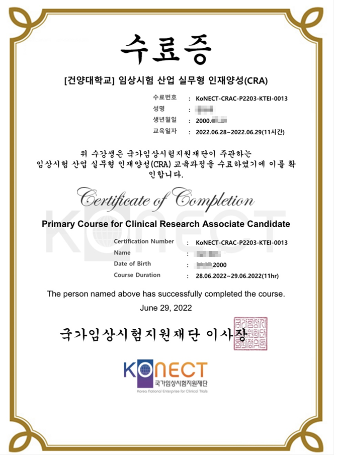 1. 프로그램 : 임상의약학과 취업역량 강화 프로그램 2. 운영주제 : CRO 데이터 관리 및 모니터링 3. 일 시 : ‘22.6.28(화) ~ 29(수) 3. 장 소 : 국가임상시험지원재단(KoNECT) 4. 인 원 : 임상의약학과 재학생 20명 5. 추진내용 - 3, 4학년 재학생의 국가임상시험지원재단 방문을 통한 대면 교육 - 현장 전문가 특강 및 실습 - 국내 CRO 분야에서 활용되고 있는 EMR, SDV 프로그램 및 환자 빅데이터를 이용한 산업체 직무교육 및 체험(국가임상시험지원재단의 협조)